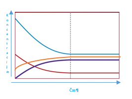 Na grafu koncentracija v odvisnosti od časa sta z svetlo modro in rdečo krivuljo zarisani spremembi koncentracije reaktantov. Z oranžno in s temno modro pa sta zarisani krivulji produktov. Levo od črtkane črte se koncentracija ne spreminja več. Pravimo, da je stalna.