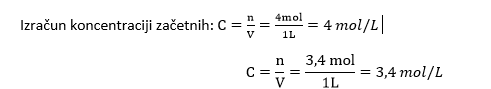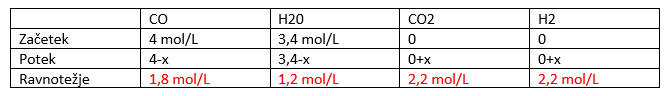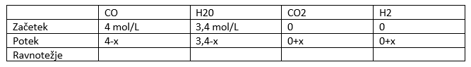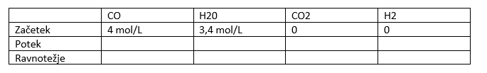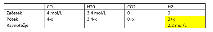 Zgled težje naloge: Na začetku imamo 4 mol ogljikovega monoksida in 3,4 mol vode. Zanima nas kolikšna je koncentracija CO2, če nastane 2,2 mol vodika.