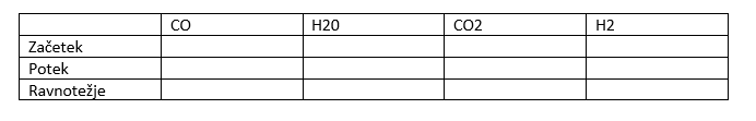 2. V drugem delu vaje ustvarimo tabelo tako, da prepišemo reaktante in produkte v zgornjo vrstico tabele. Na skrajno desno stran vpišemo začetek, potek in ravnotežje.