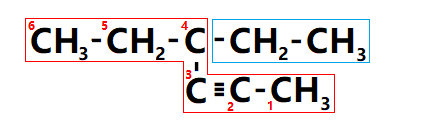 Spojina je alkin, saj vsebuje trojno vez. Končnica spojine bo tako -in. Najdaljša odljikovodikova veriga ima 6 ogljikovih atomov in vsebuje trojno vez (rdeča barva) ter vsebuje etilno skupino (modra barva). Dvojna oz. trojna vez ima prednost pri oštevilčenju ogljikov v verigi, zato bo prvi ogljik na desni strani verige. Trojna vez leži med drugim in tretjim ogljikovim atomom, zato bo osnova spojine poimenovana heks-2-in. Etilna skupina leži na četrtem ogljikovem atomu, zato bo substituent poimenovan kot 4-etil.