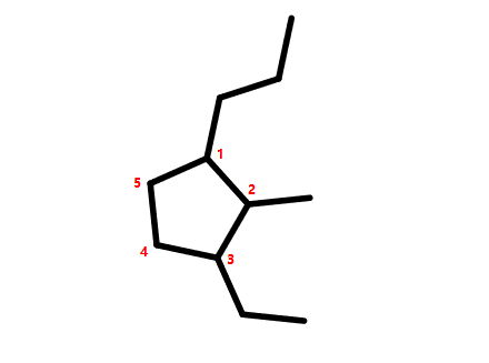Prikazana je skeletna formula spojine. Osnova je cikloalkan s petimi ogljikovimi atomi, zato je osnova ciklopentan. Potrebno je še določiti ogljikove atome v verigi in substituente. V tem primeru je prvi ogljikov atom tisti, ki ima najdaljši substituent, se pravi ogljikov atom s propilno skupino, nato pa oštevilčimo preostale ogljike v eno ali drugo smer tako, da bodo imeli substituenti najmanjše številke. V tem primeru ogljike označimo v smeri urinega kazalca. Tako metilna skupina leži na drugem, etilna skupina pa na tretjem ogljikovem atomu. Substituente razvrstimo po abecednem vrstnem redu, tako bo imel etil prednost pred metilom, ta pa bo imel prednost pred propilom.