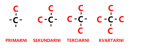 Ogljikove atome v ogljikovodikih lahko določimo tudi na podlagi tega, s koliko sosednjimi ogljiki je vezan. Primarni ogljikov atom je povezan z enim, sekundarni z dvema, terciarni s tremi in kvartarni s štirimi ogljikovimi atomi.