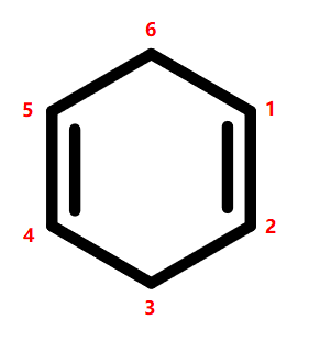 Spojina je cikličen ogljikovodik s 6 ogljikovimi atomi in dvema dvojnima vezema. Ogljikovodike oštevilčimo tako, da bosta imeli dvojni vezi čim manjše številke. Prva dvojna vez leži med prvim in drugim ogljikovim atomom, druga pa leži med četrtim in petim ogljikovim atomom, zato bo končno ime spojine cikloheksa-1,4-dien.