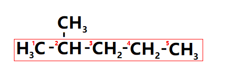 Najprej poiščemo najdaljšo verigo ogljikovih atomov. V tem primeru ima najdaljša veriga, označena z rdečo, pet ogljikovih atomov in same enojne vezi, zato je osnova pentan. Nato oštevilčimo atome ogljika v verigi tako, da bodo imeli substituenti najmanjše številke. V tem primeru leži metilna skupina na drugem ogljikovem atomu.