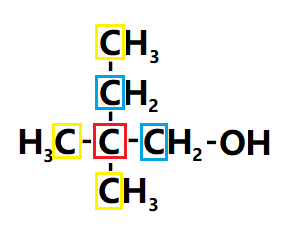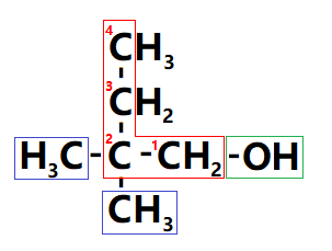 Spojina vsebuje funkcionalno skupino, imenovano hidroksilna skupina (-OH, zelena barva), zato bo ime spojine imelo končnico -ol. Najdaljša ogljikovodikova veriga ima štiri atome ogljika (rdeča barva). Pri oštevilčenju ogljikov v verigi ima funkcionalna skupina prednost, zato bo prvi ogljik v verigi tisti, ki ima nase vezano -OH skupino. Tako bo osnova spojine butan-1-ol. Obe metilni skupini ležita na drugem ogljikovem atomu (modra barva), zato bodo substituenti pred osnovo poimenovani kot 2,2-dimetil.